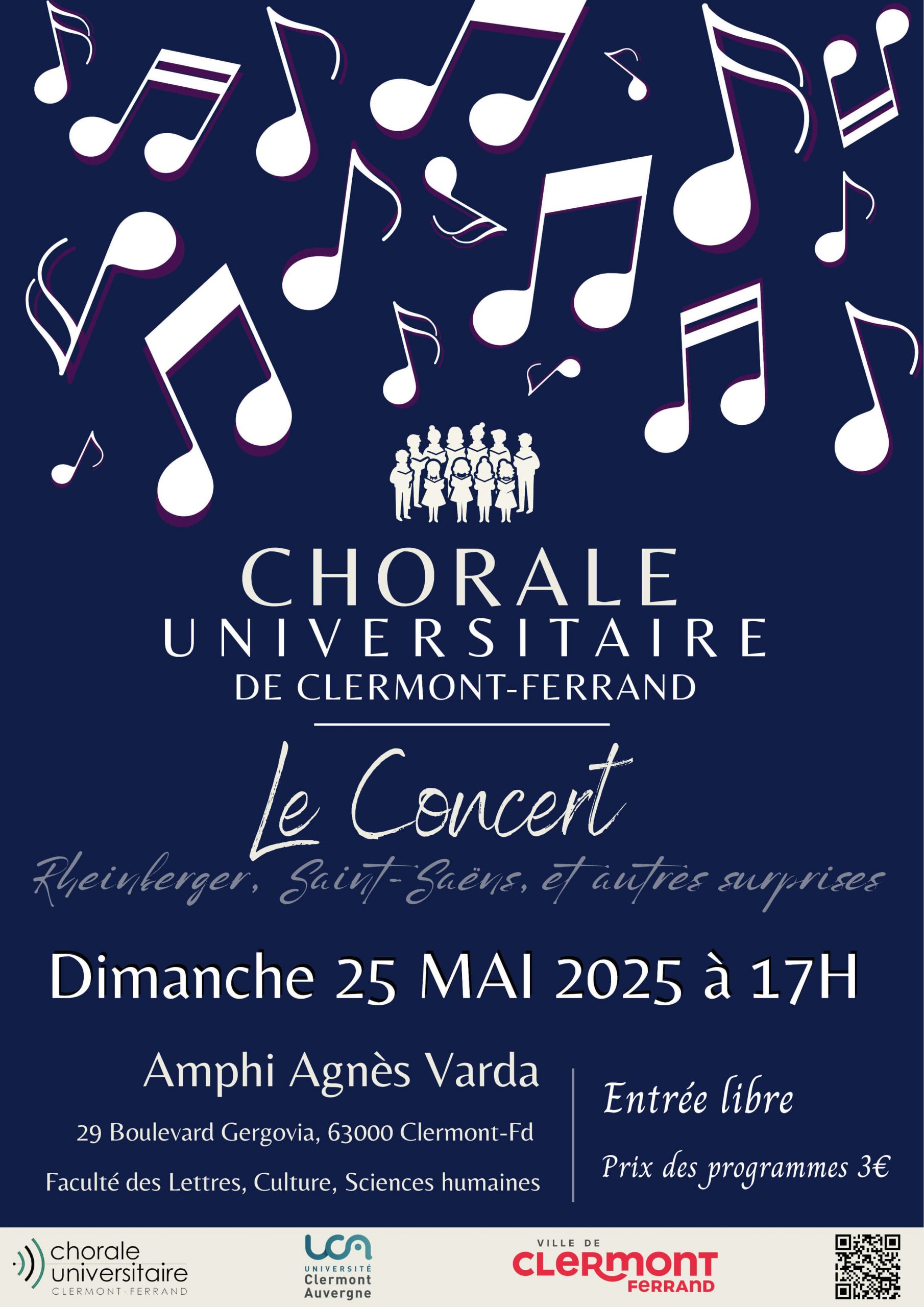 Nous donnerons un premier concert cette année le dimanche 25 mai à 17h dans l’amphitéâtre Agnès Varda, à la Fac de Lettre de Clermont-Ferrand. Au programme, le Stabat Mater Op. 138 de Rheinberger et l’Op. 68, le Calme des Nuits et Les Fleurs et les Arbres de Saint-Saëns, ainsi que d’autres surprises que vous découvrirez le jour J. Notre chœur sera accompagné d’un piano pour égayer notre prestation.